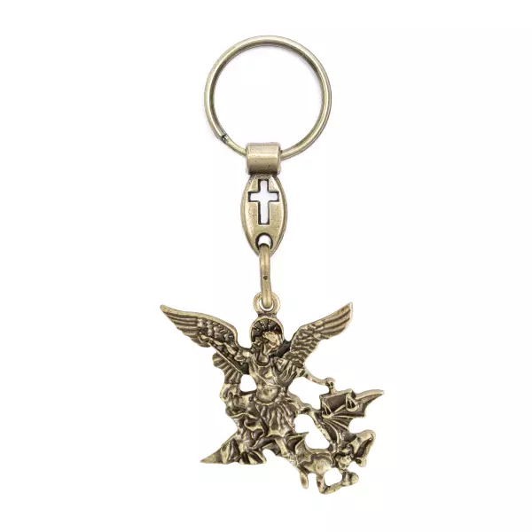 Chaveiro de São Miguel Arcanjo. Confeccionado em metal e com um visual que traz traços artísticos únicos, bem como um design clássico aliados a elementos modernos, ele transmite beleza e requinte, sem deixar de lado a sua conexão com a fé. Desenvolvido em material de excelente qualidade que garante mais resistência e durabilidade.
