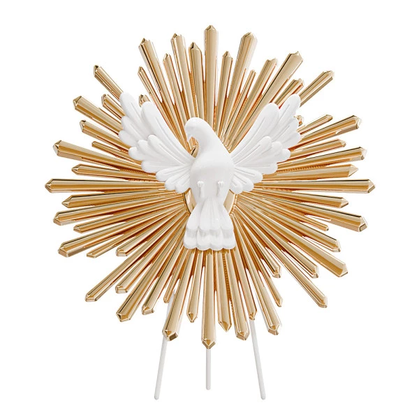 Adorno de mesa Esplendor do Divino Espírito Santo 25cm. Esplendor confeccionado em metal no banho ouro light e a Pomba que representa o Espírito Santo na cor branco, é um lindo objeto decorativo, mas também de fé e devoção, que transmite a Paz. Perfeito para se ter em casa. Com um visual que traz traços artísticos únicos, bem como um design clássico aliados a elementos modernos, ele transmite beleza e requinte, sem deixar de lado a sua conexão com a fé. Desenvolvido em material de excelente qualidade que garante mais resistência e durabilidade,