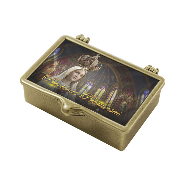 Caixinha Preciosas Promessas com a imagem de Nossa Senhora de Fátima, confeccionada em metal na cor branco, ela foi desenvolvida com o intuito de oferecer a praticidade de estar a todo tempo, próximo da Palavra de Deus. Contém diversos versículos bíblicos, sendo uma boa escolha para um presente ou ações de evangelização. Entendemos que não é possível vivermos sem analisar as Escrituras da Bília, pois a Palavra de Deus alimenta e fortalece a nossa alma.