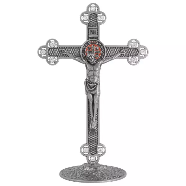 Adorno de mesa Crucifixo com a Medalha de São Bento 25cm. Confeccionado em metal e com um visual que traz traços artísticos únicos, bem como um design clássico aliados a elementos modernos, ele transmite beleza e requinte, sem deixar de lado a sua conexão com a fé. Desenvolvido em material de excelente qualidade que garante mais resistência e durabilidade.