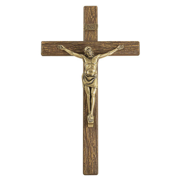 Crucifixo em metal com efeito de madeira e aplicação do acabamento exclusivo amadeirado, rico em detalhes que transmite a essência verdadeira da Cruz de Cristo. Este é um dos diversos modelos de Crucifixos disponíveis na loja Etik Artigos Religiosos.