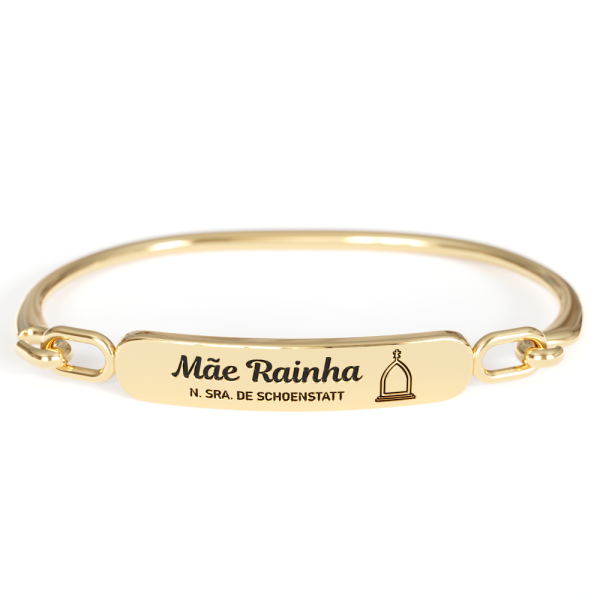 Linda Pulseira com a escrita Mãe Rainha Sossa Senhora de Schoenstatt. Confeccionada em metal no banho ouro light ela é regulável no pulso. Acessório feminino que demonstra grande respeito e devoção no uso diário.
