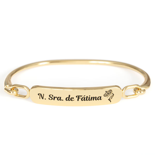 Linda Pulseira com a escrita Nossa Senhora de Fátima. Confeccionada em metal no banho ouro light ela é regulável no pulso. Acessório feminino que demonstra grande respeito e devoção no uso diário.