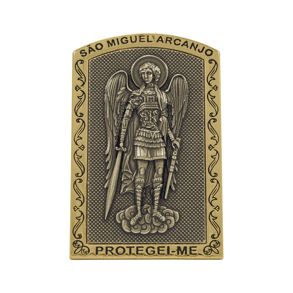 Adorno de mesa Quadro de São Miguel Arcanjo Dourado com Ouro Velho 10cm. Confeccionado em metal e com um visual que traz traços artísticos únicos, bem como um design clássico aliados a elementos modernos, ele transmite beleza e requinte, sem deixar de lado a sua conexão com a fé. Desenvolvido em material de excelente qualidade que garante mais resistência e durabilidade.